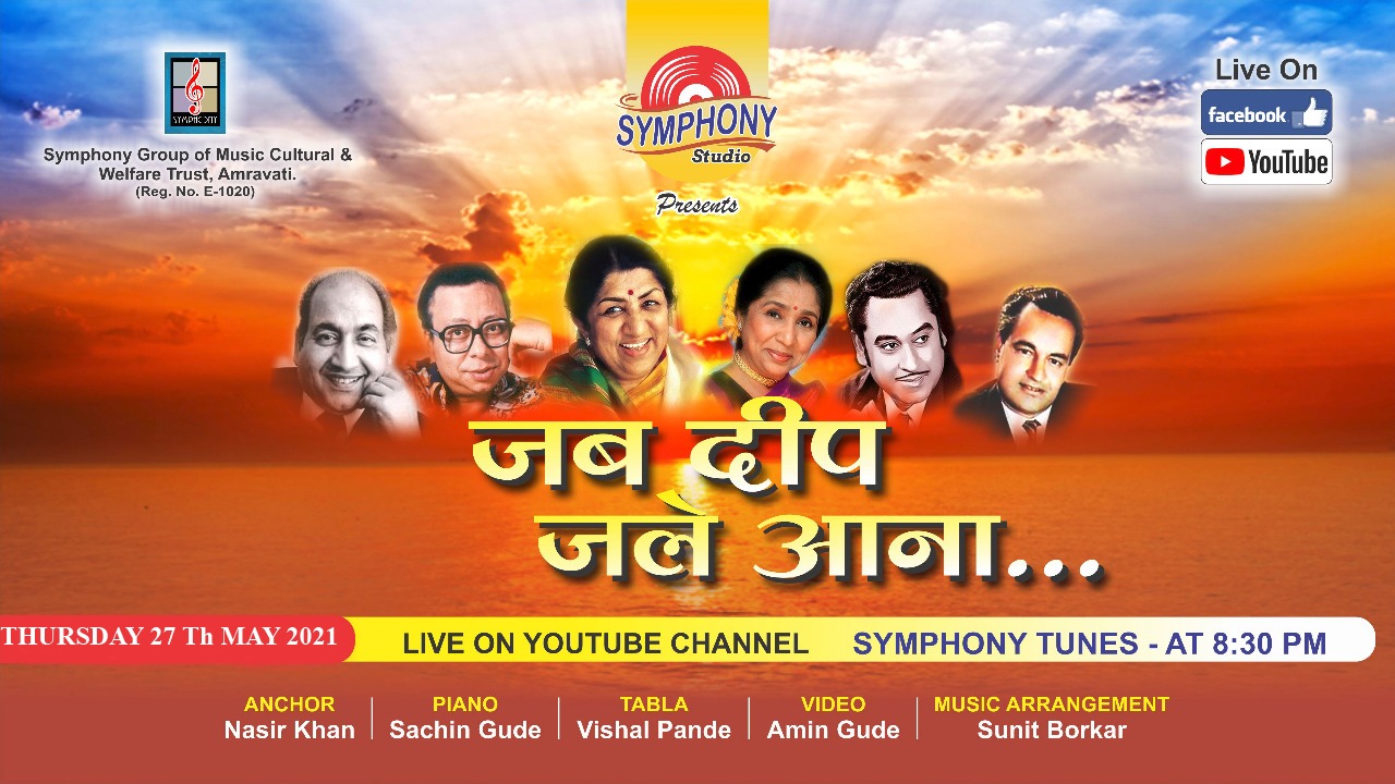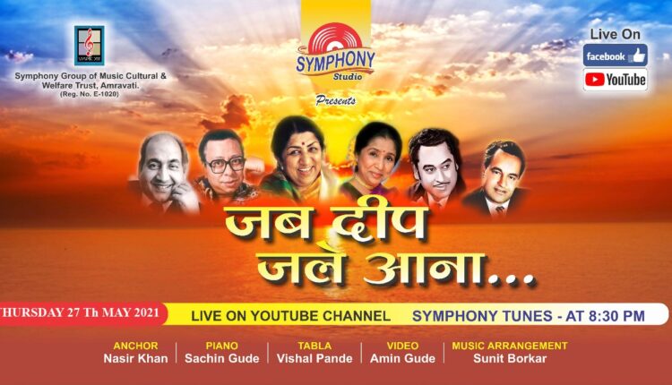 बहुगुणी डेस्क, अमरावतीः  सिंफनी गृप ऑफ म्युझिक कल्चरल अॅण्ड वेलफअर ट्रस्ट अमरावती आणि सिंफनी स्टुडिओ एक नवीन उपक्रम घेऊन येत आहे. ‘जब दीप जले आना’ या शीर्षकाखाली निवडक गीतांची ऑनलाईन मैफल गुरुवार दिनांक 27 मे रोजी रात्री 8.३० वाजता होणार आहे. ही मैफल सिंफनी स्टुडिओचे फेसबूक पेज व सिंफनी स्टुडिओचे युट्यूब चॅनल (सिंफनी ट्यून्स) वर लाईव्ह असणार आहे. सर्व रसिकांना या कार्यक्रमाचा नि:शुल्क आनंद घेता येईल.