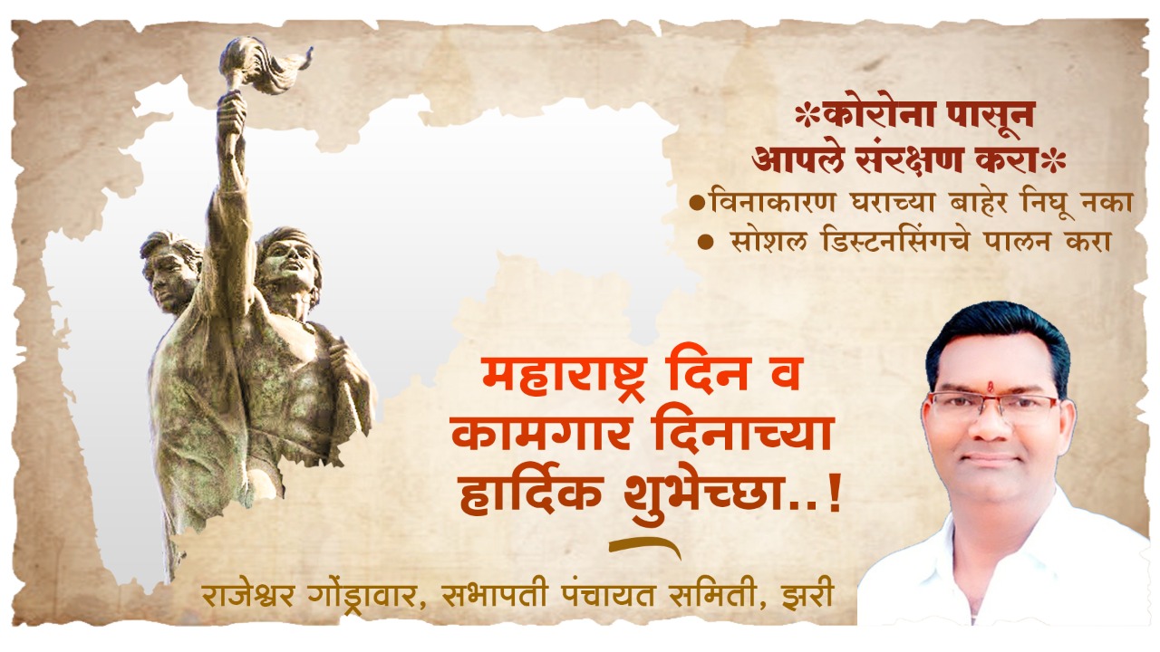 शुभेच्छुक - राजेश्वर गोंड्रावार, सभापती पंचायत समिती झरी ऍडव्हटोरिअल महाराष्ट्र दिन व कामगार दिनाच्या राजेश्वर गोंड्रावार यांच्या कडून हार्दिक शुभेच्छा कोरोनाच्या संसर्गापासून आपला बचाव करा.... By WaniBahuguni Desk On May 1, 2020 0 99 Share शुभेच्छुक – राजेश्वर गोंड्रावार, सभापती पंचायत समिती झरी Lead StoryRajeshwar Gondrawar 0 99 Share WhatsAppFacebookTwitter
