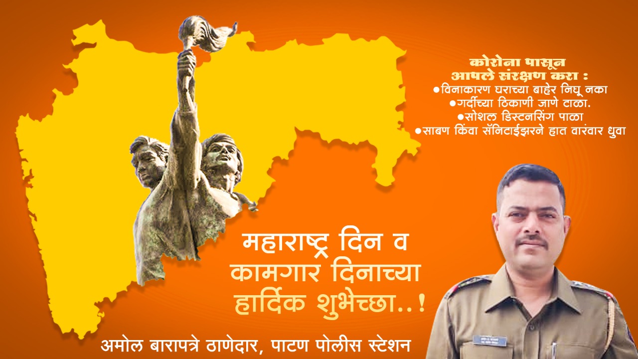 शुभेच्छुक- अमोल बारापत्रे, ठाणेदार पाटण पोलीस स्टेशन ऍडव्हटोरिअल महाराष्ट्र दिन व कामगार दिनाच्या अमोल बारापत्रे यांच्याकडून हार्दिक शुभेच्छा कोरोनापासून आपला बचाव करा....... By WaniBahuguni Desk On May 1, 2020 0 109 Share शुभेच्छुक- अमोल बारापत्रे, ठाणेदार पाटण पोलीस स्टेशन Lead StoryPatan 0 109 Share WhatsAppFacebookTwitter