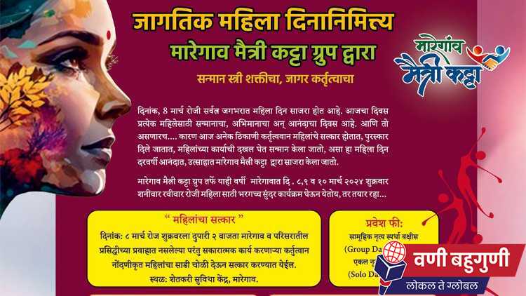 बहुगुणी डेस्क, मारेगाव: 8 मार्चला सर्वत्र जागतिक महिला दिन जगभर साजरा केला जातो. याच पर्वावर येथील मारेगाव मैत्री कट्टा ग्रुपने सलग 3 दिवस ‘सन्मान स्त्री शक्तीचा, जागर कर्तृत्वाचा’ हा उपक्रम हाती घेतला. या अंतर्गत दिनांक 8, 9 व 10 मार्चला विविध कार्यक्रमांचे आयोजन करण्यात आले आहे. पहिल्या दिवशी स्थानिक शेतकरी सुविधा केंद्रात दुपारी 2 वाजता प्रसिद्धीच्या प्रवाहात नसलेल्या; परंतु भरीव कामगिरी करणाऱ्या महिलांचा सत्कार करण्यात येईल. कर्तुत्वान नोंदणीकृत महिलांचा साडीचोळी प्रदान करण्यात येईल.  कार्यक्रमाच्या अध्यक्षस्थानी ज्येष्ठ पत्रकार संतोष कुंडकर राहतील. प्रमुख पाहुणे म्हणून वसंत जिनिंग मारेगावचे संचालक गजानन खापने, माजी नगराध्यक्ष इंदू किन्हेकर, हे मान्यवर उपस्थित राहणार आहेत.