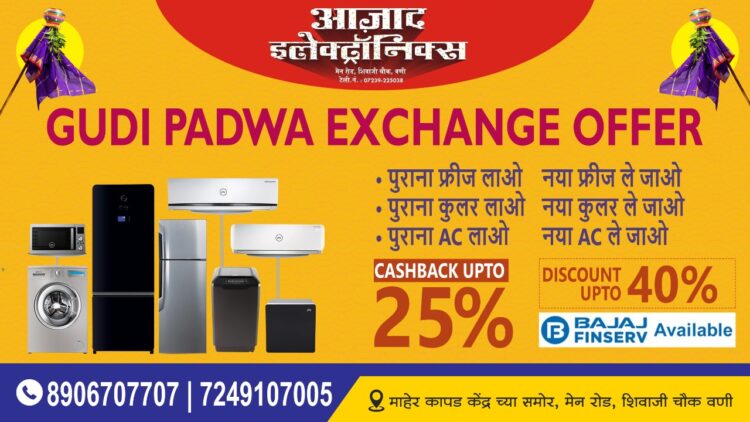 आझाद इलेक्ट्रॉनिक्समध्ये खास गुडीपाडव्यानिमित्त एसी व फ्रिजवर एक्सचेंज ऑफर सुरू करण्यात आली आहे. यात जुना फ्रिज देऊन ग्राहकांना नवीन फ्रिज घरी घेऊन जाता येणार आहे. यात ग्राहकांना तब्बल 40 टक्के डिस्कॉउंट दिले जाणार आहे. जर ही वस्तू त्यांनी डेबिट कार्ड किंवा क्रेडिट कार्डने खरेदी केल्यास त्यात आणखी 25 टक्के पर्यंतची बचत ग्राहकांना करता येणार आहे.
