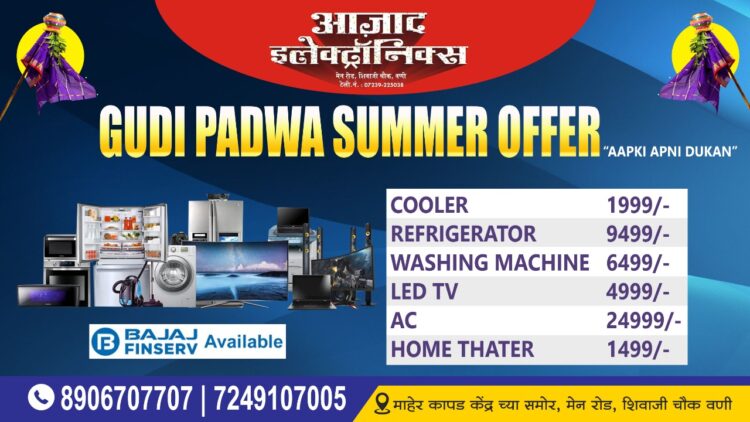 पुरुषोत्तम नवघरे, वणी: गुढीपाडवा निमित्त शहरातील सुप्रसिद्ध इलेक्ट्रॉनिक्स व होम अप्लायन्सेसचे शोरूम आझाद इलेक्ट्रॉनिक्स येथे ‘ठंडा ठंडा कुल कुल’ अशी समर ऑफर’ सुरू झाली आहे. यात ब्रॅण्डेड एअर कंडिशनर, कुलर इत्यादी वस्तूंवर 25 ते 40% पर्यंत डिस्काउंट मिळणार आहे. ऑफर अंतर्गत कुलर अवघ्या 1990 रुपये, एसी 24990 रुपये, फ्रिज 9490, वॉशिंग मशिन 6490 रु. एलईडी टीव्ही 4990 रुपये, होम थिएटर 1490 रुपयांमध्ये उपलब्ध होणार आहे.* विशेष म्हणजे ही ऑफर केवळ गुढीपाडव्यानिमित्त मर्यादीत कालावधी व स्टॉक संपतपर्यंतच उपलब्ध राहणार आहे.