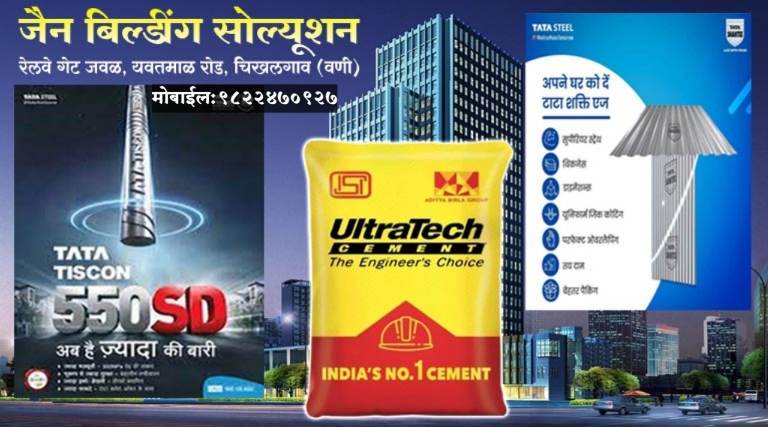 घर बांधकामासाठी उच्च प्रतीचे सिमेंट, लोखंडी सळई व टिनपत्रे मिळण्यासाठी वणी तालुक्यात जैन बिल्डींग सोल्युशन हा एक विश्वसनीय प्रतिष्ठान आहे. यवतमाळ मार्गावर चिखलगाव रेल्वे गेटजवळ स्थित जैन बिल्डींग सोल्युशनमध्ये TATA TISCON गंजप्रूफ लोखंडी सळई, TATA SHAKTI टिनपत्रे, अल्ट्राटेक सिमेंटसह कंपाउंड जाळी, फेंसिंग वायर, स्क्वेअर पाईप होलसेल दरात उपलब्ध आहे.