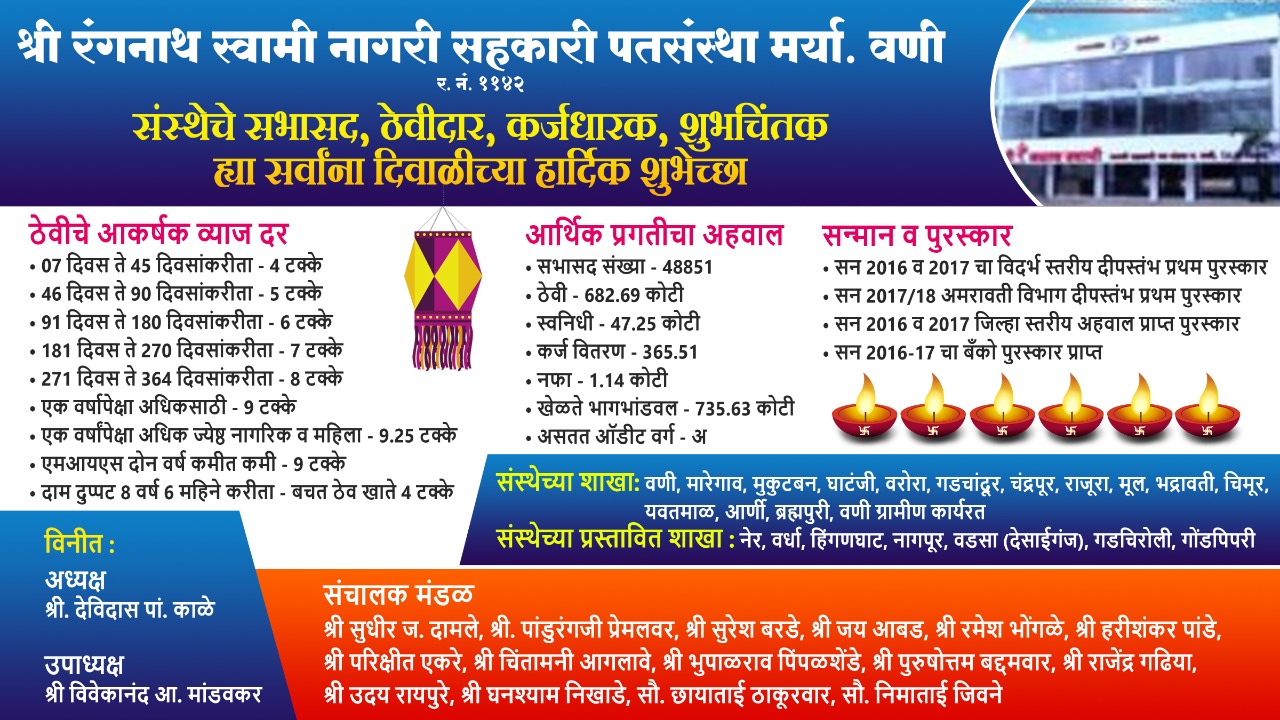 ऍडव्हटोरिअलवणीवार्ता रंगनाथ स्वामी ना. स. पतसंस्थेतर्फे सर्वांना दिवाळीच्या हार्दिक शुभेच्छा शुभेच्छुक: ऍड. देविदास काळे, विवेकानंद मांडवकर व संचालक मंडळ By WaniBahuguni Desk On Nov 5, 2021 21 Share Lead Story 21 Share WhatsAppFacebookTwitter