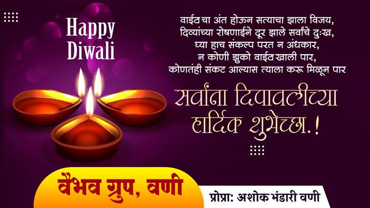 ऍडव्हटोरिअलवणीवार्ता वैभव गृप तर्फे सर्वांना दिवाळीच्या हार्दिक शुभेच्छा शुभेच्छुक: अशोक भंडारी, संचालक वैभव गृप, वणी By WaniBahuguni Desk On Nov 5, 2021 9 Share Lead Story 9 Share WhatsAppFacebookTwitter