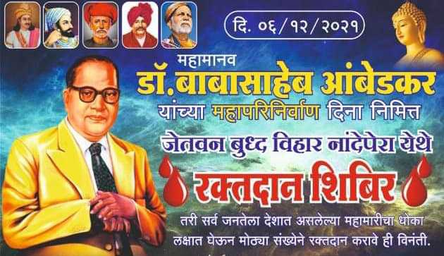 तालुक्यातील नांदेपेरा येथे सोमवार 6 डिसेंबर रोजी महामानव डॉ बाबासाहेब आंबेडकर यांच्या महापरिनिर्वाण दिनाचे औचित्य साधून भव्य रक्तदान शिबिराचे आयोजन करण्यात आले आहे. सदर रक्तदान शिबिर हे जेतवन बुद्ध विहार नांदेपेरा येथे सकाळी 10 ते दुपारी 2 वाजेपर्यंत राहणार आहे. या रक्तदान शिबिराचे आयोजन भारतीय बोद्ध महासभा शाखा नांदेपेरा/ पोहना यांच्याद्वारे करण्यात आले आहे.