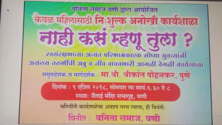 ‘‘नाही कसं म्हणू तुला?’’ या शीर्षकांतर्गत ही कार्यशाळा सोमवार दिनांक 9 एप्रिल 2018 रोजी सायंकाळी 6.30 ते 8.30 या वेळेत श्री जैताई देवस्थान सभागृहात होणार आहे. पुणे येथील समुपदेशक व मार्गदर्शक श्रीकांत पोहनकर या कार्यशाळेला मार्गदर्शन करतील. स्वसंरक्षणाच्या अत्यंत सोप्या युक्त्या या कार्यशाळेत सांगितल्या जातील. काही प्रात्यक्षिकेही करून दाखविली जातील. ही मोफत कार्यशाळा फक्त महिला व युवतींसाठी असून याचा लाभ घेण्याची विनंती वनिता समाजाच्या वतीने अध्यक्षा भारती सरपटवार यांनी केली आहे.