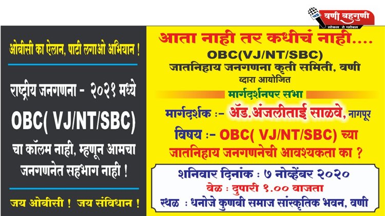 सुनील इंदुवामन ठाकरे, वणी: ओबीसी(व्हीजे,एनटी,एसबीसी) जातनिहाय जनगणना कृती समितीद्वारा उद्या शनिवार दि.७ नोव्हेंबर २०२० ला दुपारी १.०० वाजता “धनोजे कुणबी समाज भवन,वणी” येथे “मार्गदर्शपर सभा” होणार आहे. या सभेत ऍड. अंजली साळवे ह्या ओबीसी( व्हीजे,एनटी,एसबीसी)च्या जातनिहाय जनगणनेची आवश्यकता का? या विषयावर मार्गदर्शन करणार आहेत.