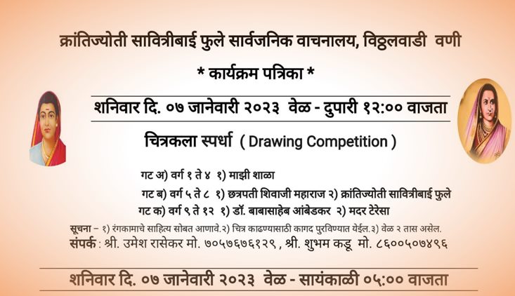 पुरुषोत्तम नवघरे, वणी: शहरातील विठ्ठलवाडी येथील क्रांतीज्योती सावित्रीबाई फुले सार्वजनिक वाचनालयानिमित्त वणीमध्ये 7 व 8 जानेवारीला विविध स्पर्धेंचे आयोजन करण्यात आले आहे. सावित्रीबाई फुले जयंतीनिमित्त या स्पर्धा होणार आहे. ७ जानेवारी २०२३ ला दुपारी १२:०० वाजता चित्रकला स्पर्धा यामध्ये गट (अ) वर्ग १ ते ४ थी यात माझी शाळा हा विषय राहणार आहे. गट (ब) वर्ग ५ ते ८ वी असून यात छत्रपती शिवाजी महाराज अथवा क्रांतिज्योती सावित्रीबाई फुले दे दोन विषय राहणार आहेत. तर गट (क) वर्ग ९ ते १२ वी साठी डॉ. बाबासाहेब आंबेडकर अथवा मदर टेरेसा यांचे चित्र काढायचे आहे.
