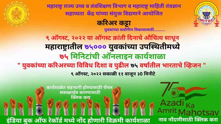 पुरुषोत्तम नवघरे, वणी: दहावी- बारावीच्या परीक्षा संपता-संपताच घराघरात विद्यार्थ्यांचे करिअर, पुढील शिक्षण याविषयी चर्चा सुरू होते. मात्र, अनेकदा विद्यार्थी याबाबत संभ्रमात असतात. डोळसपणे सर्व बाबींचा विचार करून आणि योग्य मार्गदर्शन घेणे महत्त्वाचे आहे. ही बाब लक्षात घेऊन दिनांक 09 ऑगस्ट क्रांती दिनाचे औचित्य साधून राज्यातील 75000 युवकांच्यासाठी विक्रमी कार्यशाळा ऑनलाईन आयोजित करण्यात आलेली आहे. या कार्यशाळेत सहभागी होण्यासाठी दिनांक 7 ऑगस्ट 2022 पूर्वी नोंदणी प्रक्रिया पूर्ण करणे आवश्यक आहे.