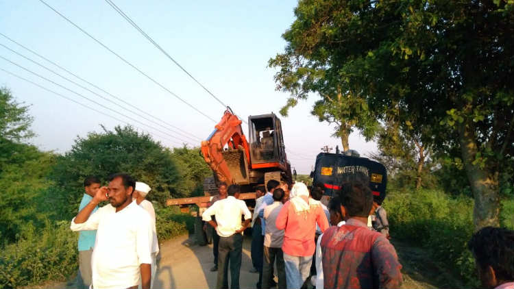 जेसीबी नेत असताना रस्त्यावरील तारांना जेसीबीचा स्पर्श