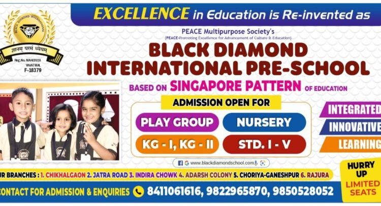 बहुगुणी डेस्क, वणी: शालेय शिक्षणात सर्वोत्कृष्ट मानला गेलेल्या सिंगापूर पॅटर्न वणीतील एकमेव ब्लॅक डायमंड इंटरनॅशनल प्री स्कूलमध्ये राबवला जातो. ब्लॅक डायमंड स्कूलच्या शहरातील चिखलगाव, जत्रारोड, इंदिरा चौक, आदर्श कॉलनी, छोरिया (गणेशपूर) यासह राजूरा या शाखेत CBSE सिलॅबसचे शिक्षण सिंगापूर पॅटर्नमध्ये दिले जाते. या शाळेत प्ले स्कूल, नर्सरी, केजी 1 केजी 2 व वर्ग 1 ते 5 चे शिक्षण दिले जाते. शाळेसाठी सध्या प्रवेश सुरू झाला असून अवघ्या मोजक्या जागा शिल्लक आहेत. त्यामुळे पालकांनी त्वरित आपल्या पाल्याचा प्रवेश निश्चित करावा असे आवाहन शाळा व्यवस्थापनाद्वारे करण्यात आले आहे.
