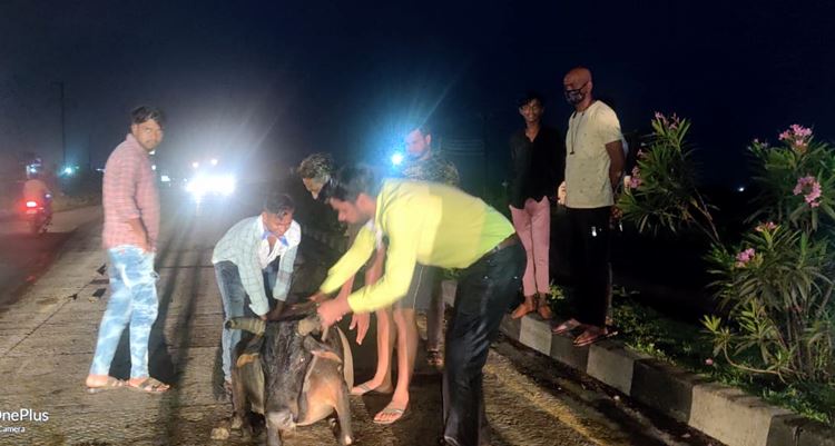 सदर रस्त्यावर वाहनांची वरदळ सुरू असल्याने डॉ. विलास, दीपक व घटनास्थळी असलेल्या काहींनी जखमी गायीला उचलून रस्त्याच्या कडेला जन्नत हॉटेल समोरील मोकळ्या जागेवर आणले. तिथे गायीला पाणी पाजण्याचा प्रयत्न केला. मात्र गायीचे पोट फुगले व काही वेळातच गायीचा मृत्यू झाला. गायीला वाचवता आले नाही याची त्यांनी खंत व्यक्त केली.