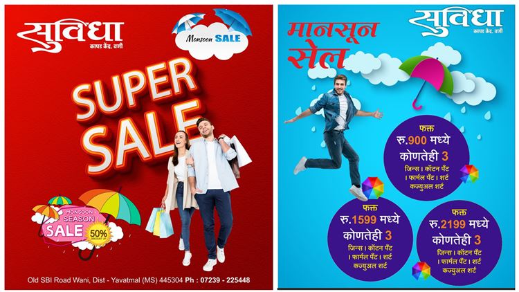 उन्हाळ्यात अनेक ग्राहक ऑफरसाठी विचारणा करतात. मात्र उन्हाळ्यात सिजनमुळे फार कमी ब्रँडवर ऑफर असते. मात्र आता खास मान्सून ऑफर सुविधा कापड केंद्र तर्फे करण्यात आली आहे. ही ऑफर सर्वसामान्यांसाठी तर आहेच शिवाय ब्रँडेड कपड्यांच्या चाहत्यांसाठी देखील आहे. ही ऑफर फक्त स्टॉक असे पर्यंत असल्याने स्टॉक संपला की ऑफर संपणार. त्यामुळे ग्राहकांनी लवकरात लवकर भेट द्यावी, आपल्या आवडीच्या कपड्यांची ऑफरमध्ये खरेदी करावी व निराशा टाळावी.