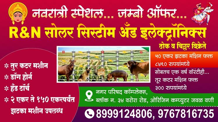 घाम गाळून पिकवलेले पीक केवळ वन्यप्राण्यांमुळे उद्ध्वस्त होते. यात मोठ्या प्रमाणात आर्थिक नुकसान सोसावे लागते. यापासून बचाव करण्याासाठी अनेक शेतकरी विष प्रयोग, दारुगोळ्याचा प्रयोग किंवा कुंपणाला इलेक्ट्रिक करंट देखील लावला जातो. मात्र यामुळे अनेकदा जंगली जनावरासह पाळीव प्राण्यांचा तसेच प्रसंगी याचा करंट लागून मनुष्याचा देखील मृत्यू होतो. R & N सोलर सिस्टिम ऍन्ड इलेक्ट्रॉनिक्स या प्रतिष्ठानमध्ये सोलरवर चालणारी झटका मशिन उपलब्ध आहे. ही मशिन लावल्यास पिकांचे तर रक्षण होतेच शिवाय कुठलीही जीवित हानी होणार नाही.