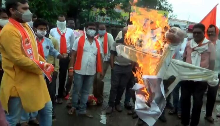 जब्बार चीनी, वणी: बेळगाव जिल्ह्यातील मनगुत्ती गावातील छत्रपती शिवाजी महाराजांचा पुतळा हटवल्याच्या निषेधार्थ संतप्त शिवसैनिकांनी वणीत कर्नाटकचे मुख्यमंत्री येदुरप्पा यांचा पुतळा जाळून निषेध केला. रविवारी दुपारी शिवेसेनेचे जिल्हा प्रमुख विश्वास नांदेकर यांच्या नेतृत्वात हे आंदोलन करण्यात आले. यावेळी शिवसैनिकांनी येदिरप्पा सरकारविरोधात जोरदार घोषणाबाजी केली.