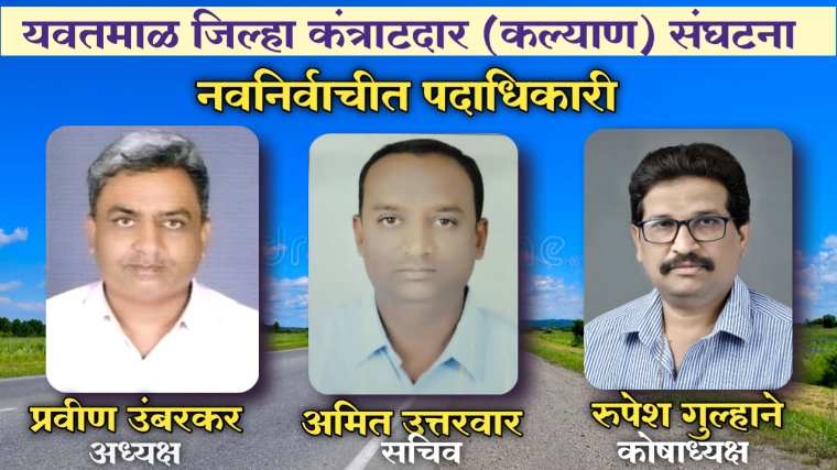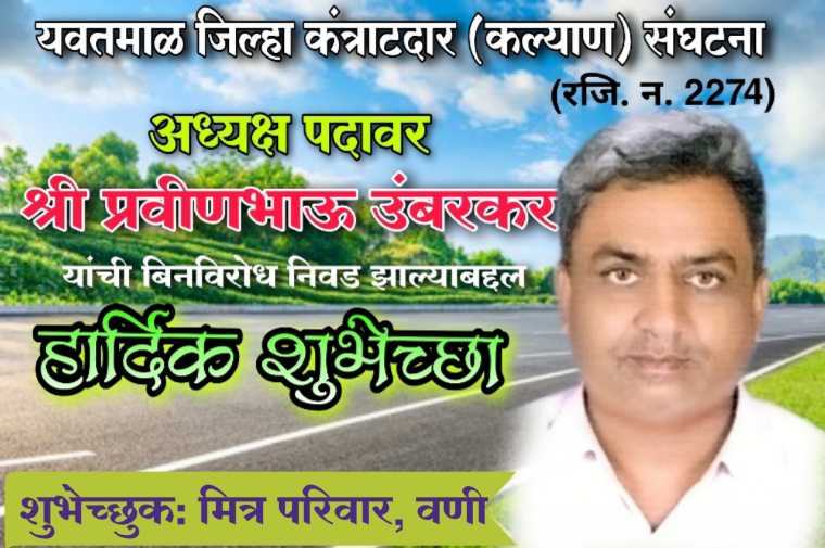 यवतमाळ जिल्हा कंत्राटदार कल्याण संघटनेचे मावळते अध्यक्ष अरविंद वाढोणकर यांनी नवनिर्वाचित अध्यक्ष प्रवीण उंबरकर यांना पुढील कार्यकालसाठी शुभेच्छा दिली. विशेष म्हणजे यवतमाळ जिल्हा कंत्राटदार कल्याण संघटनेचा अध्यक्ष पद पहिल्यांदा वणी विभागाला मिळाला आहे. प्रवीण उंबरकर यांची अध्यक्ष पदावर निवड झाल्याबद्दल जिल्ह्यातील कंत्राटदार व मित्र परिवाराकडून शुभेच्छांचे वर्षाव होत आहे.