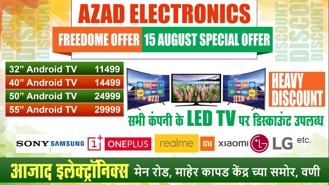 आझाद इलेक्ट्रॉनिक्समध्ये सोनी, सॅमसंगस, वन प्लस, रिअलमी, एमआय शाओमी, एलजी इत्यादी कंपनीच्या ऍन्ड्रॉईड टीव्ही उपलब्ध असून 32 इंच ऍन्ड्रॉईड टीव्ही अवघ्या 11499 रुपयांपासून सुरू आहे. तर 40 इंच 14,499 रुपये, 50 इंच 24999 रुपये तर 55 इंच ऍन्ड्रॉईड टीव्ही अवघ्या 29999 रुपयांमध्ये ग्राहकांना खरेदी करता येणार आहे. या पद्धतीचे डिस्कॉउंट वणीमध्ये पहिल्यांदाच देण्यात येत आहे.