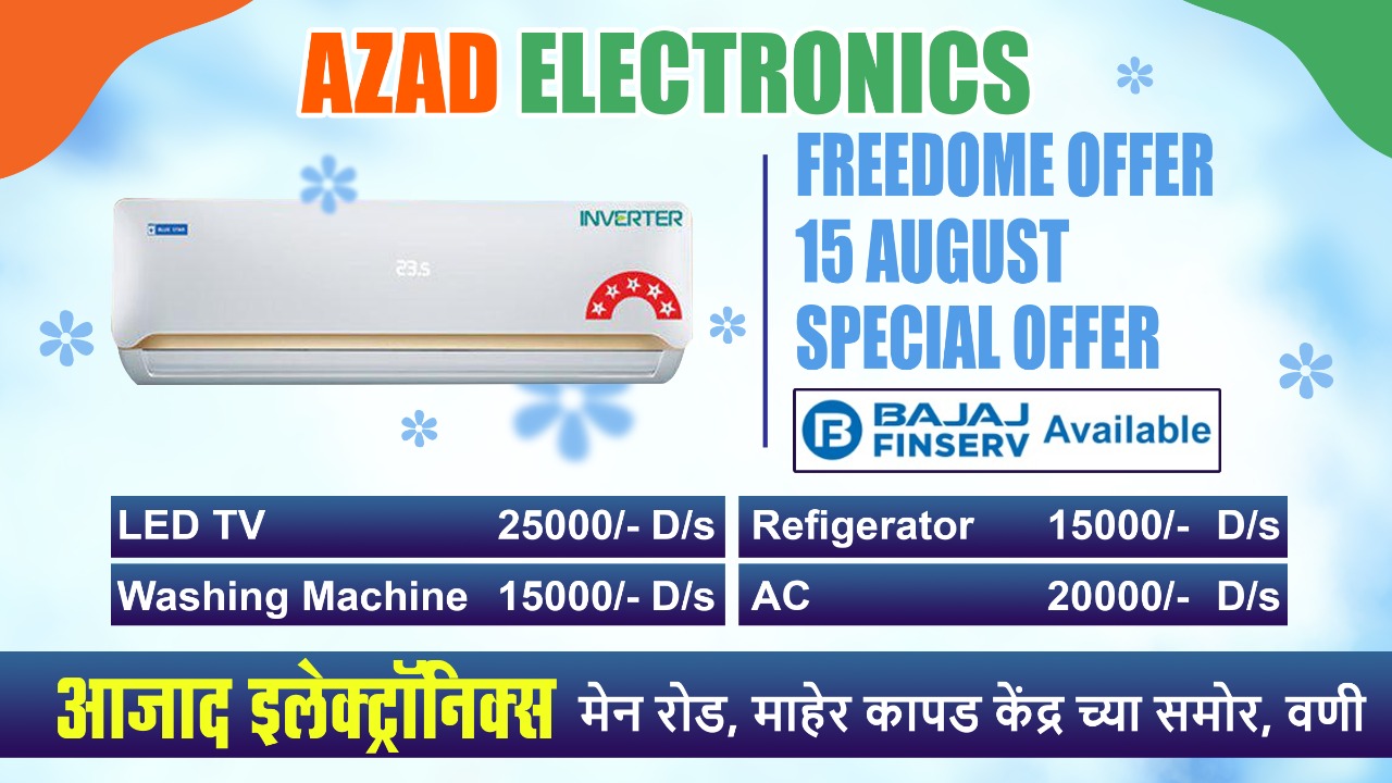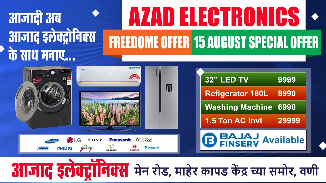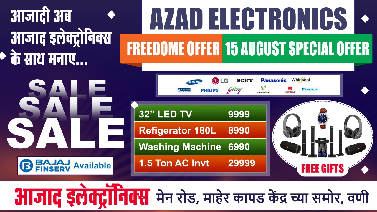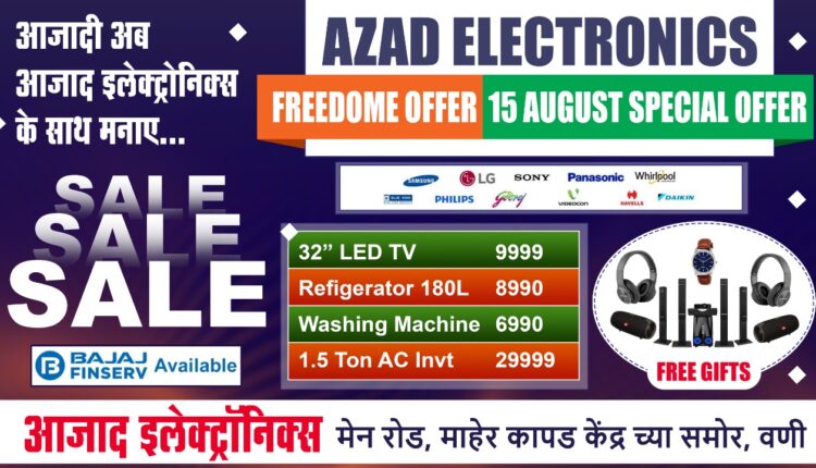 आझाद इलेक्ट्रॉनिक्स हे सर्व प्रकारच्या होम अप्लायन्सेच्या विक्रीसाठी परिसरात प्रसिद्ध आहे. ‘फ्रीडम ऑफर’चा लाभ घेण्यासाठी व वस्तूंच्या डेमोसाठी मार्केट रोडवरील शिवाजी चौक, माहेर कापड केंद्रासमोरील आझाद इलेक्ट्रॉनिक्स व शाम टॉकिज जवळील प्रतिष्ठानात भेट द्यावी असे आवाहन आझाद इलेक्ट्रॉनिक्सचे संचालक राजकुमार अमरवानी व दिलीप अमरवानी यांच्यातर्फे करण्यात आले आहे.