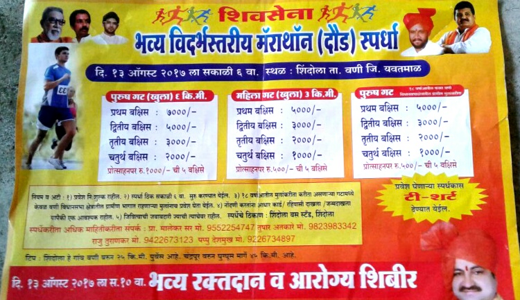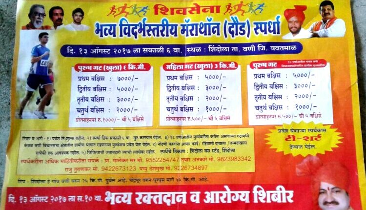 प्रतिनिधी, शिंदोला: दिनांक 13 ऑगस्ट रविवारी शिमदोला येथें मॅरेथॉन स्पर्धेचे आयोजन करण्यात आले आहे. सकाळी सहा वाजता या स्पर्धेचं आयोजन करण्यात आलं आहे. शिव बहूउद्देशीय संस्था व संजय निखाडे मित्र परिवारातर्फे ही विदर्भ स्तरीय मॅरेथॉन स्पर्धा आयोजित केली गेली आहे. मॅरेथान स्पर्धे दरम्यान रक्तदान  व आरोग्य शिबिराचे आयोजन देखील करण्यात आलं आहे.