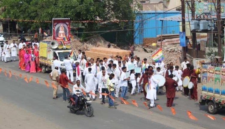 जितेंद्र कोठारी, वणी: सकल जैन समाजाच्या वतीने मुकुटबन येथे गुरुवार 14 एप्रिल रोजी भगवान महावीर जयंती उत्साहात साजरी करण्यात आली. यावेळी जैन स्थानकापासून काढण्यात आलेल्या शोभायात्रेने संपूर्ण गावकऱ्यांचे लक्ष वेधले. अहिंसा परमो धर्म, महावीर का यह संदेश- जिओ ओर जीने दो, शुद्द आहार, शाकाहार असे संदेश लिहिलेली पाट्या व झेंडे हातात घेऊन बाळ गोपालही या शोभायात्रेत सहभागी झाले होते.