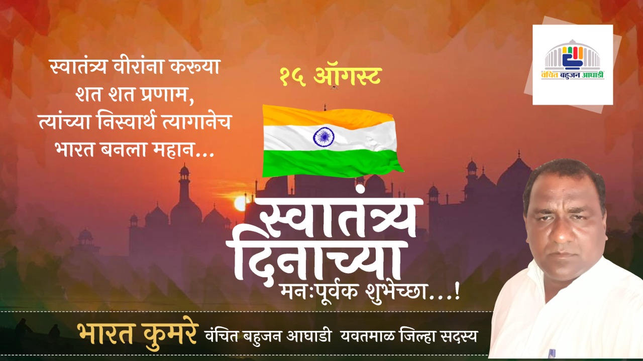 ऍडव्हटोरिअलवणीवार्ता 74 व्या स्वातंत्र्य दिनाच्या सर्वांना हार्दिक शुभेच्छा… शुभेच्छुक : भारत कुमरे, वंचित बहुजन आघाडी By WaniBahuguni Desk On Aug 14, 2020 0 14 Share Lead Story 0 14 Share WhatsAppFacebookTwitter