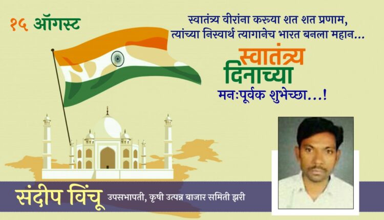 ऍडव्हटोरिअलवणीवार्ता 74 व्या स्वातंत्र्य दिनाच्या सर्वांना हार्दिक शुभेच्छा…. शुभेच्छुक : संदीप विंचू , उपसभापती कृषी उत्पन्न बाजार समिती झरी By WaniBahuguni Desk On Aug 14, 2020 0 14 Share Lead Story 0 14 Share WhatsAppFacebookTwitter