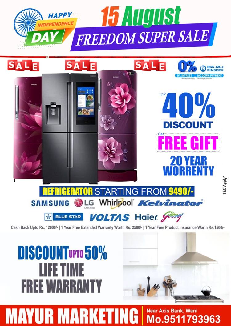 फ्रिज 9490 रुपयांपासून सुरू होत आहे. सोबतच फ्रिजवर 40 टक्के पर्यंत डिस्काउंट व 20 वर्षांची वॉरंटी सोबतच स्वातंत्र्य् दिनानिमित्त एक स्पेशल गिफ्ट देखील दिले जाणार आहे. तर डबल डोअरच्या फ्रिजवर सिंगल डोअर फ्रिज फ्रि दिला जाणार आहे. सॅमसंग, एलजी, व्हर्लपूल, केल्विनेटर, ब्ल्यूस्टार, वोल्टास, हायर, गोदरेज इत्यादी कंपनीच्या फ्रीज उपलब्ध आहेत. वॉशिंग मशिनच्या टॉप लोड आणि फ्रँट लोडच्या विविध रेंज उपलब्ध आहे. यावरही 40 टक्के पर्यंतची सूट आहे. सोबत ईलेक्ट्रीक प्रेस किंवा मिक्सर यापैकी एक वस्तू ग्राहकांना गिफ्ट दिली जाणार आहे.