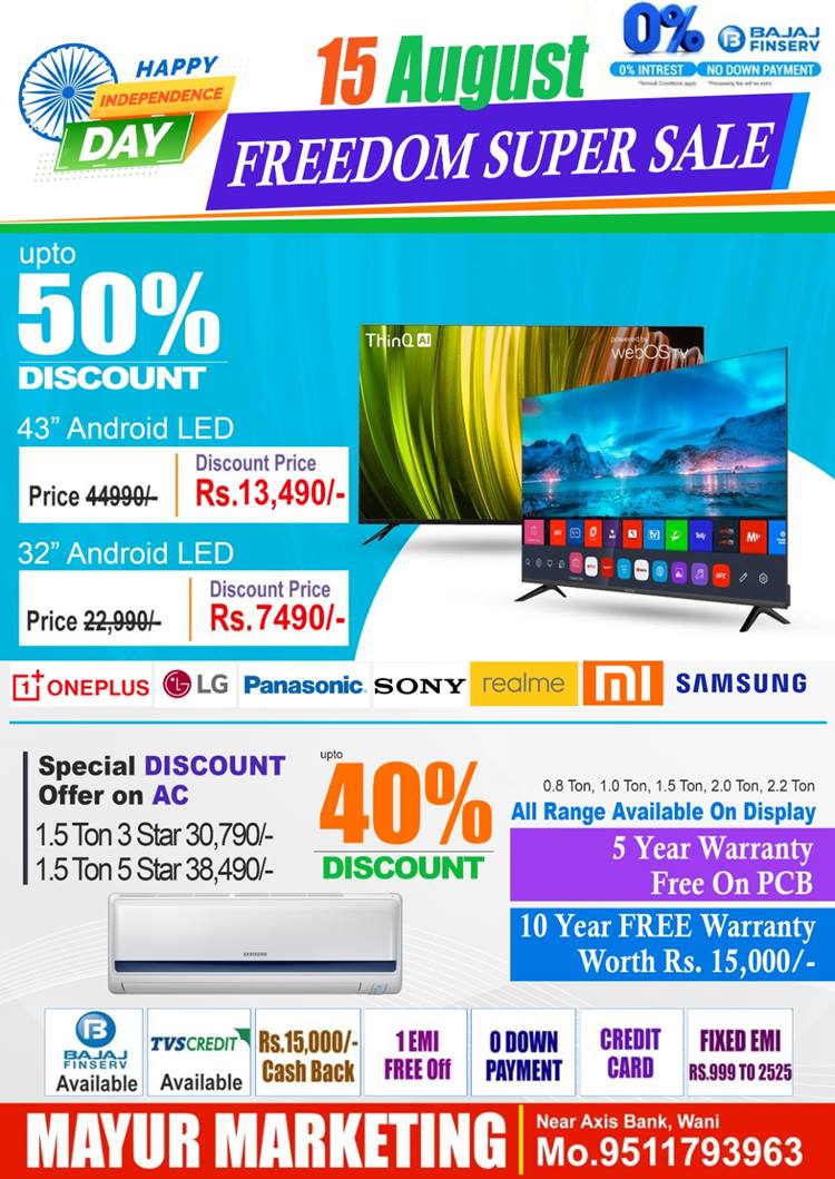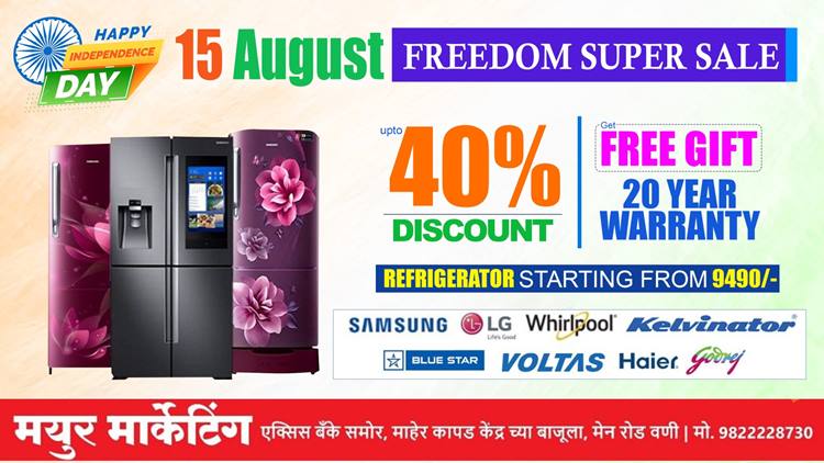 बहुगुणी डेस्क, वणी: स्वातंत्र्य दिनानिमित्त शहरातील सुप्रसिद्ध मयूर मार्केटिंगमध्ये फ्रिडम सुपर सेल हा बम्पर सेल सुरू झाला आहे. यात सर्व वस्तू ऑनलाईनपेक्षा कमी दरात मिळत असून वस्तूंवर आकर्षक गिफ्ट, वॉरंटीसह प्रत्येक वस्तूंवर एक गिफ्ट दिले जाणार आहे.* शिवाय कार्डद्वारा खरेदी केल्यास ऑफरपेक्षाही कमी दरात वस्तू ग्राहकांना मिळणार आहे. विशेष म्हणजे डबल डोअरच्या फ्रिजवर सिंगल डोअर फ्रिज मोफत तर एलईडी टीव्हीच्या काही मॉडेलवर चक्क साउंडबार मोफत दिला जाणार आहे. रेफ्रिजरेटर (फ्रिज) वर 15 हजार रुपयांपर्यतचे डिस्काउंट (सोबतच 20 वर्ष वॉरन्टी), वॉशिंग मशिनवर 10 हजारांपर्यंत डिस्कॉउंट देण्यात येणार आहे (4 वर्षांची वॉरंटी) प्रेस किंवा मिक्सर गिफ्ट दिले जाणार आहे. ईएमआयवर वस्तू विकत घेतल्यास एक ईएमआय मोफत दिला जाणार आहे.