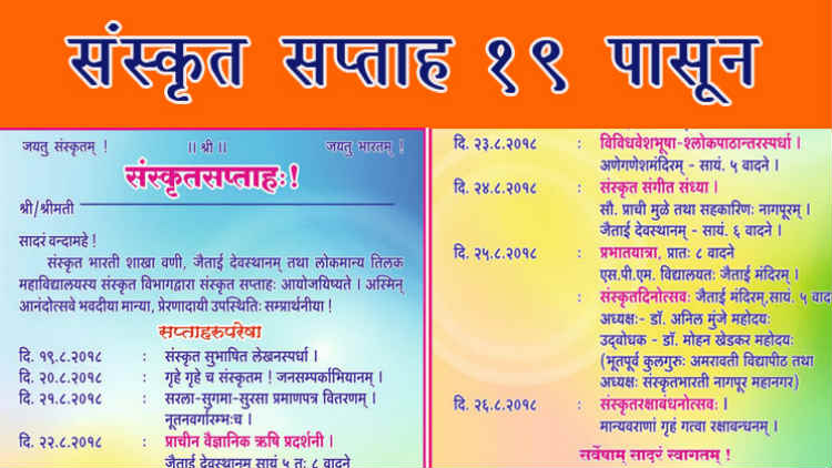 बहुगुणी डेस्क, वणी : श्रावण शुद्ध पौर्णिमेला आंतरराष्ट्रीय स्तरावर सादर होणाऱ्या संस्कृत दिनाच्या निमित्ताने वणी नगरीत दिनांक 19 पासून 26 पर्यंत संस्कृत सप्ताहाचे आयोजन करण्यात आले आहे.संस्कृत भारती ची वणी शाखा ,जैताई देवस्थान आणि लोकमान्य टिळक महाविद्यालयाचा संस्कृत विभाग यांच्या संयुक्त विद्यमाने आयोजित या संस्कृत सप्ताहात दिनांक 19 रोजी शालेय विद्यार्थ्यांची संस्कृत सुभाषित लेखनस्पर्धा, 20 रोजी जनसंपर्क अभियान, 21 रोजी सरला ,सुगमा ,सुरसा या संस्कृत परीक्षांमध्ये यशस्वी विद्यार्थ्यांना प्रमाणपत्र वाटप हे एक कार्यक्रम घेण्यात येतील.