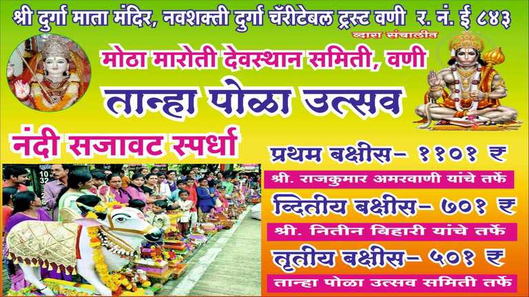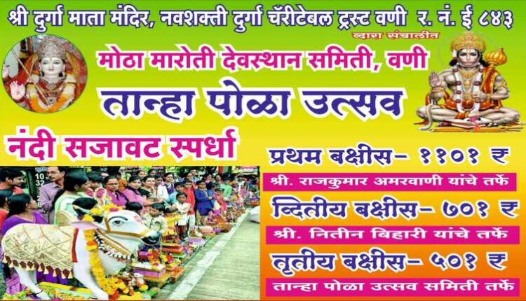 जितेंद्र कोठारी, वणी : वणी शहरात तान्हा पोळाचा उत्सव मोठ्या उत्साहाने साजरा केल्या जाते. शहरातील शेकडो बालगोपाल लाकडाच्या नंदी बैलाची आकर्षक सजावट करून बेंडबाजासह  आंबेडकर चौक परिसरात मोठा मारोती देवस्थान येथे आणतात. उत्कृष्ट सजावट केलेल्या नंदी बैलाला आकर्षक पारितोषिक दिल्या जाते. दरवर्षी प्रमाणे यावर्षी मोठा मारोती देवस्थान समितीच्या वतीने नंदीबैल सजावट स्पर्धाचे आयोजन करण्यात आले आहे.