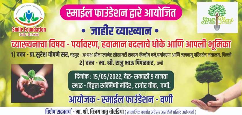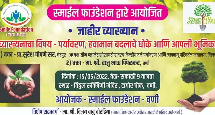 पुरुषोत्तम नवघरे, वणी: आज रविवारी दिनांक 15 मे रोजी विठ्ठल रुक्मिणी मंदिर, टागोर चौक येथे सकाळी 9:30 वाजता सुप्रसिद्ध शास्त्रज्ञ व पर्यावरण प्रेमी प्रा. डॉ. सुरेश चोपणे यांचे पर्यावरण या विषयावर  व्य़ाख्यान आयोजित करण्यात आले आहे. तर पर्यावरण प्रेमी राजू पिंपळकर ग्लोबल वार्मिंग या विषयावर मार्गदर्शन करणार आहे. डॉ. सुरेश चोपणे हे ग्रीन प्लानेट सोसायटी या संस्थेचे अध्यक्ष असून ते पर्यावरण मंत्रालय नवी दिल्ली याचे सदस्य देखील आहेत. एक पर्यावरण प्रेमी, खगोल, ऑर्कॉलॉजिस्ट तज्ज्ञ म्हणून त्यांची महाराष्ट्राला ओळख आहे. सामाजिक कार्यकर्ते व उद्योजक विजयबाबू चोरडिया यांच्या मार्गदर्शनात आणि स्माईल फाउंडेशनच्या पुढाकाराने या कार्यक्रमाचे आयोजन करण्यात आले आहे. सदर कार्यक्रमाला वणीतील पर्यावरणप्रेमींनी व वणीकरांनी मोठ्या संख्येने उपस्थित राहण्याचे आवाहन स्माईल फाउंडेशनचे अध्यक्ष सागर जाधव यांनी केले आहे.