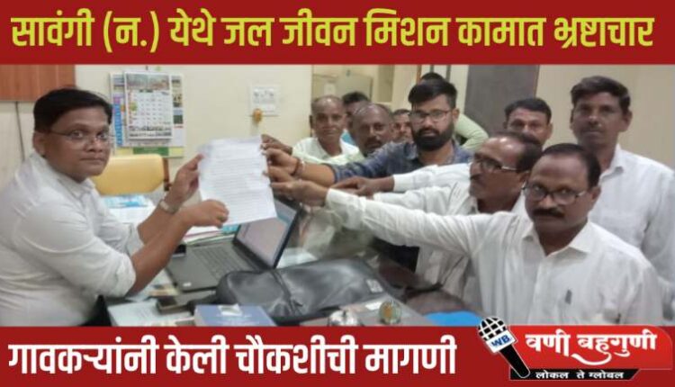 जितेंद्र कोठारी, वणी : तालुक्यातील सावंगी (नवीन) येथे जल जीवन मिशन अंतर्गत झालेल्या कामात भ्रष्टाचाराची चौकशी करण्याची मागणी गावकऱ्यांनी केली आहे. याबाबत गावातील नागरिकांनी 12 जुलै रोजी उपविभागीय अधिकारी वणी यांना निवेदन देऊन सावंगी (नवीन) येथे पंतप्रधान जल जीवन मिशनच्या कामाची सखोल चौकशी करून दोषी कंत्राटदारावर कार्यवाहीची मागणी केली आहे.