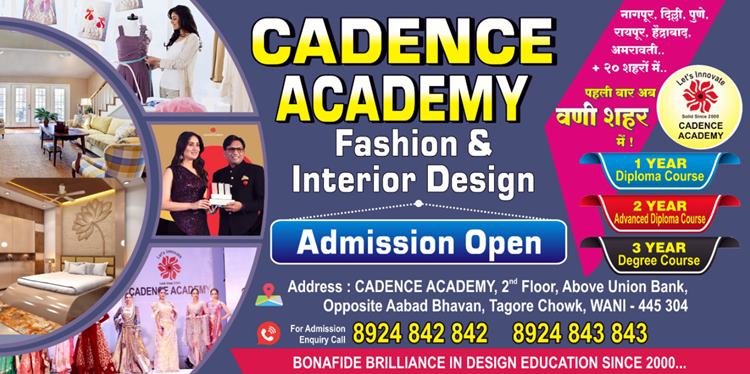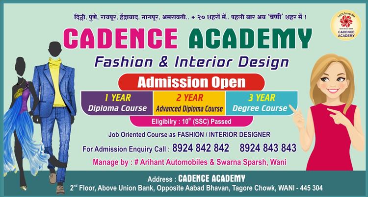 कॅडेन्स अकाडमीद्वारा 10 वी व 12 ऩंतर फॅशन आणि इंटेरिअर डिझायनिंगसाठी तीन कोर्स उपलब्ध करून दिले गेले आहे. यात 10 वी नंतर एक वर्षाचा डिप्लोमा कोर्स व दोन वर्षांचा ऍडव्हान्स डिप्लोमा तर 12 वी नंतर तीन वर्षांचा डिग्री कोर्स उपलब्ध आहे. वणीतील विद्यार्थ्यांना कॅडेन्स अकाडमी, दुसरा मजला, युनियन बँकेच्यावर आबड भवन समोर वणी येथे संपर्क साधून ऍडमिशन करता येईल तर बाहेरगावाच्या विद्यार्थ्यांना गुगल फॉर्म भरून (लिंक – https://forms.gle/Q6JHRWYSm8bd4Lo47 ) ऍडमिशन करता येईल.
