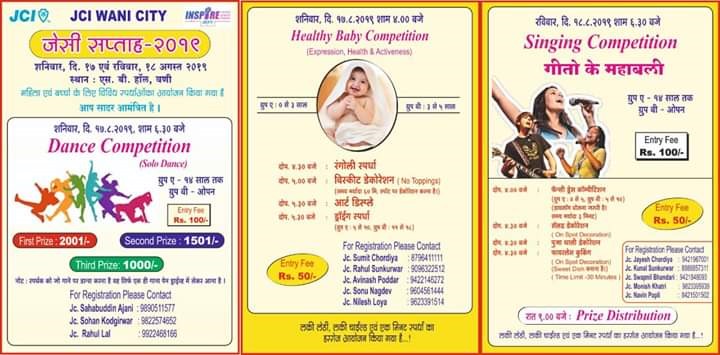 रविवारी ‘गीतो के महाबली’ ही गायनस्पर्धा होईल. यात 14 वर्षांपर्यंत ए आणि ओपन बी असे गृप् राहतील. याची प्रवेश फी 100 रूपये आहे. रविवारीच सायंकाळी चार वाजता फॅन्सी ड्रेस कॉम्पिटेशन गट शून्य ते पाच वर्ष आणि गट पाच ते 10 वर्ष अशी होईल. या स्पर्धेत डॉयलॉग म्हणणे आवश्यक आहे. वेळ मर्यादा तीन मिनिटे राहील. दुपारी 4.30 वाजता जागेवर सॅलड डेकोरेशन स्पर्धा होईल. दुपारी याच वेळी शून्य ते पाच आणि पाच ते दहा या वयोगटासाठी पूजा थाळी डेकोरेशन स्पर्धा होईल. दुपारी साडे चार वाजता फायरलेस कुकींग स्पर्धा होईल. यात जागेवर सजावट करायची आहे. स्वीट डीश करायची आहे. या स्पर्धेसाठी 30 मिनीटे वेळ देण्यात आली आहे. स्पर्धांची प्रवेश फी 50 रूपये आहे. रात्री 9 वाजता या सर्व स्पर्धांचं बक्षीस वितरण होईल. या स्पर्धांची नोंदणी जयेश चोरडिया 9421967001, जेसी कुणाल सुंकुरवार 8888857311, जेसी स्वप्निल भंडारी 9421848093, जेसी मोनीश खत्री 9823395939, जेसी नवीन पोपली 8421501502 यांच्याकडे करावी.