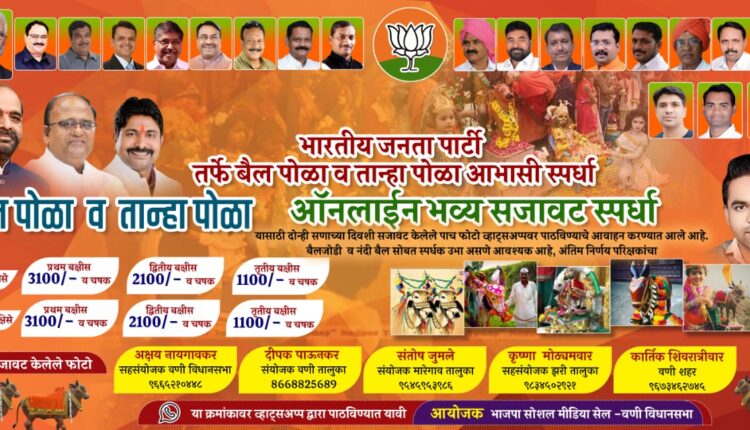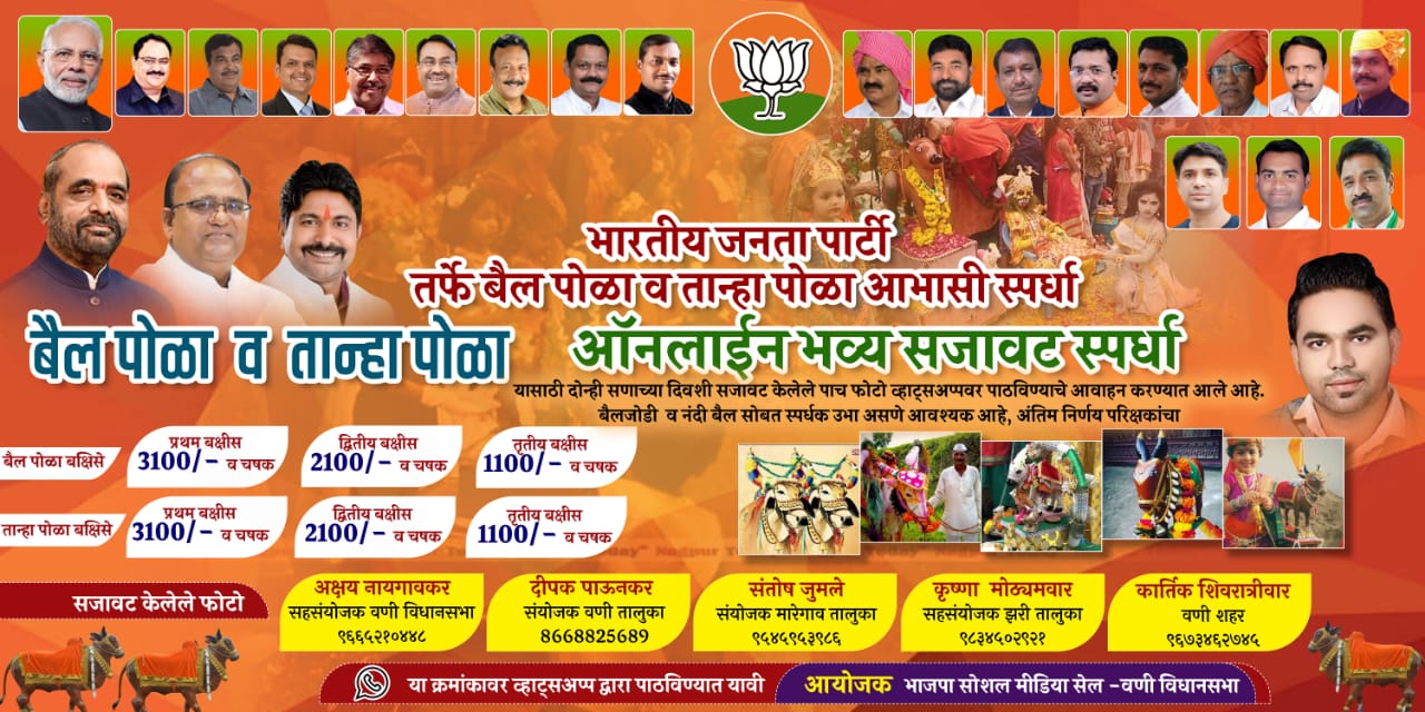 पुरुषोत्तम नवघरे, वणी: कोरोनाच्या पार्श्वभूमीवर या वर्षी सार्वजनिक रित्या बैल पोळ्याचा व तान्हा पोळ्याचा कार्यक्रम होणार नाही. त्यामुळे या वर्षी भारतीय जनता पार्टी वणी विधानसभा सोशल मीडिया सेलतर्फे बैल पोळा व तान्हा पोळ्या निमित्त आभासी (व्हर्च्युअल) सजावट स्पर्धा घेण्यात येणार आहे. यासाठी दोन्ही सणाच्या दिवशी सजावट केलेले पाच फोटो व्हाट्सअप्पवर पाठविण्याचे आवाहन करण्यात आले आहे.