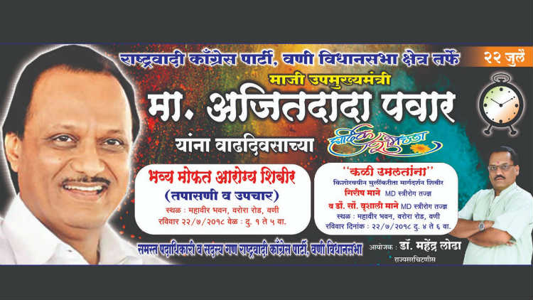 बहुगुणी डेस्क, वणीः राष्ट्रवादी काँगेसचे ज्येष्ठ नेते तथा माजी उपमुख्यमंत्री अजितदादा पवार यांच्या वाढदिवसानिमित्त मोफत आरोग्य शिबिराचे आयोजन करण्यात आले आहे. राष्ट्रवादी काँगेस पक्षाचे राज्य सरचिटणीस डॉ. लोढा यांनी या शिबिराचे आयोजन वणी स्थानिक महावीर भवन येथे 22 जुलै रोजी दुपारी 1 ते 5 वाजेपर्यंत हे तपासणी व उपचार शिबिर होईल.