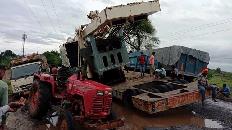 शिरपूर जवळील वारगाव फाट्याजवळ कंटेनर घेऊन जाणारे वाहन व कोळसा घेऊन जाणारा ट्रक फसल्याने या मार्गावरील वाहतूक विस्कळीत झाली आहे. कंटेनर घेऊन जाणारे वाहन खड्यात गेल्याने वाहनावरील मशिन घसरली. दरम्यान कोळसा घेऊन जाणा-या एका ट्रकने वाहन काढण्याचा प्रयत्न केला. मात्र ट्रकही खड्ड्यात फसला. दोन्ही वाहने फसल्याने शिरपूर ते चारगाव वाहनांच्या रांगा लागल्या आहेत. सध्या या मार्गावरून फक्त दुचाकीची वाहतूक सुरू आहे. आज वाहनावरील मशिन हटवणे शक्य नसल्याची माहिती आहे. त्यामुळे या मार्गावरील वाहतूक उद्या मंगळवार पर्यंत विस्कळीत राहू शकते.