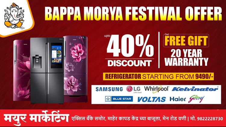 बहुगुणी डेस्क, वणी: गणेश चतुर्थी निमित्त वणीतील सुप्रसिद्ध मयूर मार्केटिंगमध्ये बाप्पा मोरया फेस्टीव्हल सुपर ऑफर सुरू झाली आहे. यात सर्व वस्तू ऑनलाईनपेक्षा कमी दरात खरेदी करता येणार असून वस्तूंवर आकर्षक गिफ्ट, वाढीव वॉरंटी व प्रत्येक वस्तूंवर एक गिफ्ट दिले जाणार आहे.* शिवाय कार्डद्वारा खरेदी केल्यास ऑफरपेक्षाही कमी दरात वस्तू ग्राहकांना मिळणार आहे. बाप्पा मोरया सुपर सेलमध्ये रेफ्रिजरेटर (फ्रिज) वर 15 हजार रुपयांपर्यतचे डिस्काउंट (सोबतच 20 वर्ष वॉरन्टी), वॉशिंग मशिनवर 10 हजारांपर्यंत डिस्कॉउंट देण्यात येणार आहे (4 वर्षांची वॉरंटी) तसेच यावस्तूंच्या खरेदीवर प्रेस किंवा मिक्सर गिफ्ट दिले जाणार आहे. तर ब्रँडेड लॅपटॉपवर मुळ किंमतीवर 20 टक्के सुट दिली जाणार आहे. तर साउंडबार, टॉव्हर स्पिकर, डीजे स्पिकर, कराओके स्पिकरवर चक्क 50 टक्के पर्यंतची सूट मिळणार आहे. तर सोनीच्या साउंडबारवरही जबरदस्त डिस्काउंट मिळणार आहे. याशिवाय कार्डद्वारे खरेदी केल्यास 15 टक्क्यांपर्यंत ग्राहकांना कॅशबॅकचा लाभही घेता येणार आहे.