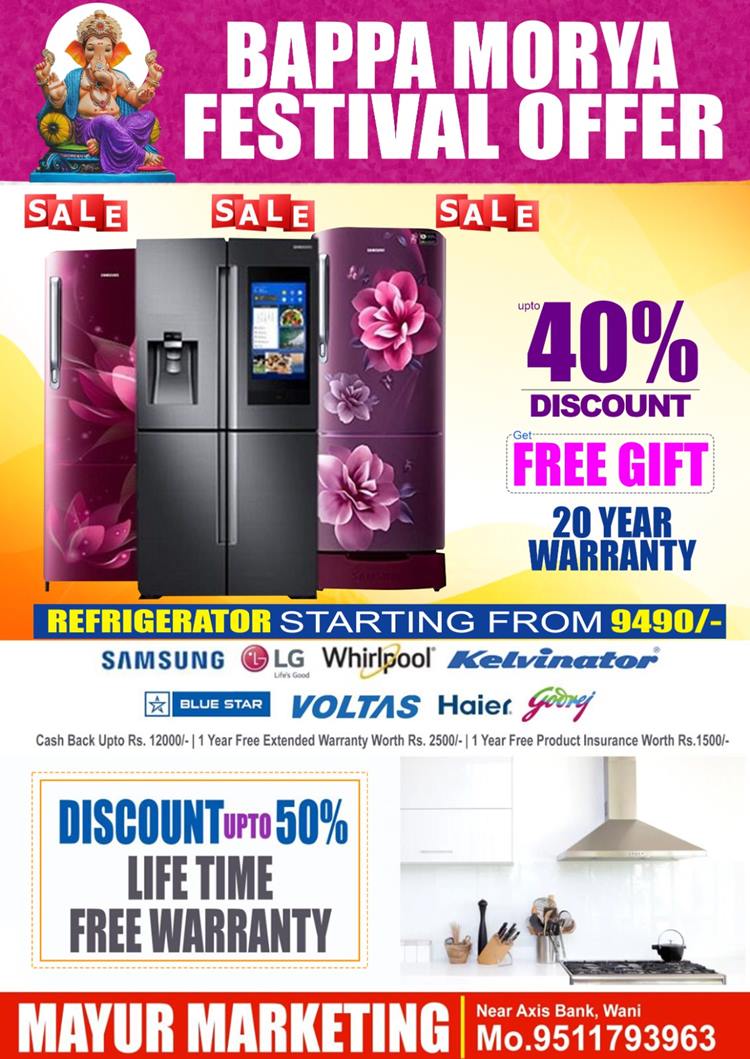 फ्रिज 9490 रुपयांपासून सुरू होत आहे. सोबतच फ्रिजवर 40 टक्के पर्यंत डिस्काउंट व 20 वर्षांची वॉरंटी सोबतच गणेशोत्सवानिमित्त एक स्पेशल गिफ्ट देखील दिले जाणार आहे. तर डबल डोअरच्या फ्रिजवर सिंगल डोअर फ्रिज फ्रि दिला जाणार आहे. सॅमसंग, एलजी, व्हर्लपूल, केल्विनेटर, ब्ल्यूस्टार, वोल्टास, हायर, गोदरेज इत्यादी कंपनीच्या फ्रीज उपलब्ध आहेत. वॉशिंग मशिनच्या टॉप लोड आणि फ्रँट लोडच्या विविध रेंज उपलब्ध आहे. यावरही 40 टक्के पर्यंतची सूट आहे. सोबत ईलेक्ट्रीक प्रेस किंवा मिक्सर यापैकी एक वस्तू ग्राहकांना गिफ्ट दिले जाणार आहे.