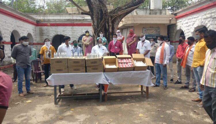 तहसिल कार्यालयाच्या आवारात सकाळी अंगणवाडी सेविका, आशा वर्कर, पोलीस कर्मचारी, होमगार्ड, ग्रामसेवक, तलाठी, मंडळ अधिकारी, पोलीस पाटील इत्यादी शासकीय कर्मचा-यांसह आरोग्य विभागाचे व नगरपालिकेचे कर्मचारी यांना सॅनिटायझर व डेटॉल साबणाचे वाटप करण्यात आले. विश्वास नांदेकर, तहसीलदार शाम धनमने, ठाणेदार वैभव जाधव, मुख्याधिकारी संदीप बोरकर यांच्या हस्ते साहित्याचे वाटप करण्यात आले.