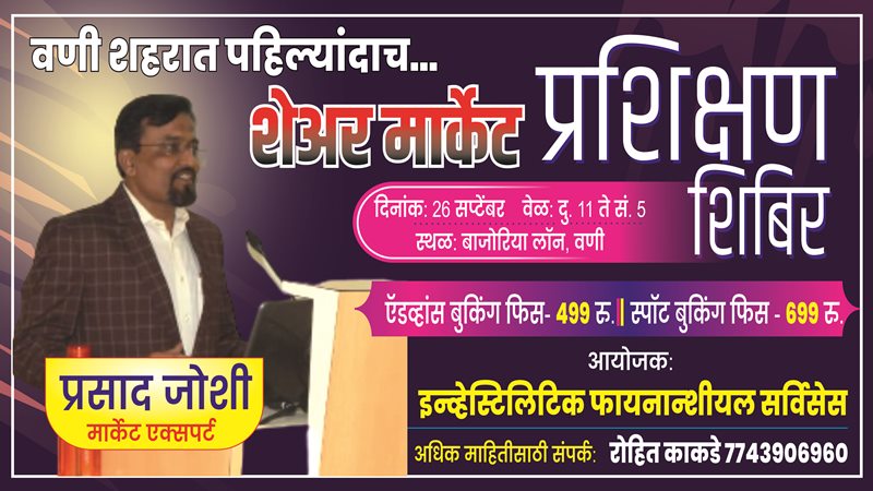 सुरेश पाचभाई: वणीत स्टॉक मार्केट संंबंधी एक दिवशीय शिबिराचे आयोजन करण्यात आले आहे. वणी शहराच्या इतिहासात पहिल्यांदाच अशा शिबिराचे आयोजन करण्यात आले आहे. यात शेअर मार्केटमध्ये कमीत कमी धोका पत्करून जास्तीत जास्त नफा कसा कमवावा, याबाबत प्रशिक्षण दिले जाणार आहे. रविवारी दिनांक 26 सप्टेंबर रोजी शहरातील बाजोरिया लॉन येथे या शिबिराचे आयोजन करण्यात आले असून 11 ते 5 या वेळेत हे शिबिर घेतले जाणार आहे. सुप्रसिद्ध स्टॉक मार्केट एक्सपर्ट व ट्रेनर प्रसाद जोशी हे उपस्थित शिबिरार्थ्यांना प्रशिक्षण देणार आहे. इनव्हेस्टलिटीक फायनान्शीअल सर्विसेसद्वारा या प्रशिक्षणाचे आयोजन करण्यात आले आहे.