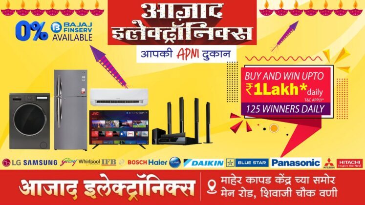 बहुगणी डेस्क, वणी: शहरातील अल्पावधीतच लोकप्रिय आणि ग्राहकांच्या पसंतीस उतरलेले आझाद इलेट्रॉनिक्स (माहेर कापड केंद्र समोर, मार्केट रोड) तर्फे दिवाळी निमित्त आज पर्यंतची सर्वात मोठी ऑफर लॉन्च करण्यात आली आहे. या ऑफर अंतर्गत प्रत्येक खरेदीवर ग्राहकांना दररोज 1 लाख रुपयांपर्यंत जिंकण्याची संधी मिळणार आहे. शिवाय रोज 125 ग्राहकांना ही संधी मिळणार आहे. तसेच प्रत्येक ग्राहकांसाठी काहीना काही विशेष सुटची ऑफर देण्यात येत आहे. ही ऑफर केवळ दिवाळी निमित्त राहणार असून या ऑफरचा त्वरित लाभ घ्यावा तसेच वस्तूंच्या डेमोसाठी त्वरित आझाद इलेक्ट्रॉनिक्स येथे भेट द्यावी असे आवाहन आझाद इलेक्ट्रॉनिक्स तर्फे करण्यात आले आहे.