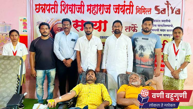 पुरुषोत्तम नवघरे, वणी: छ. शिवाजी महाराज जयंती निमित्त रविवारी दिनांक 18 फेब्रुवारी रोजी शाळा क्रमांक 8 येथे भव्य रक्तदान शिबिराचे आयोजन करण्यात आले. सत्या गृप या तर्फे या रक्तदान शिबिराचे आयोजन करण्यात आले. लाईफ लाईन ब्लड बँक नागपूर यांचे या शिबिराला सहकार्य लाभले. या उपक्रमाला संजय देरकर हे प्रमुख पाहुणे म्हणून उपस्थित होते. सकाळी 9 ते दुपारी 4 वाजेपर्यंत हे शिबिर चालले. याशिबिरात 50 रक्तदात्यांनी रक्तदान केले.  लाईफ लाईनचे डॉ. अविनाश बभारे, भाग्यश्री लांजेवार, भाग्यश्री खरवडे, वैभव बाराहाते, प्रवीण पायघन या टीमने आपली सेवा दिली. कार्यक्रमाच्या यशस्वीतेसाठी सत्या गृपचे अध्यक्ष सतिश तेवर, फैजल बशिर खान, तुलसी तेवर, निखिल येरणे, विक्री कळसकर, सूरज देठे, स्वप्निल आत्राम, अनिकेत कुरेवार, असलान शेख, रौनक तरारे, भूषण सहारे, क्रुष्णा निमसटकर यांनी परिश्रम घेतले.