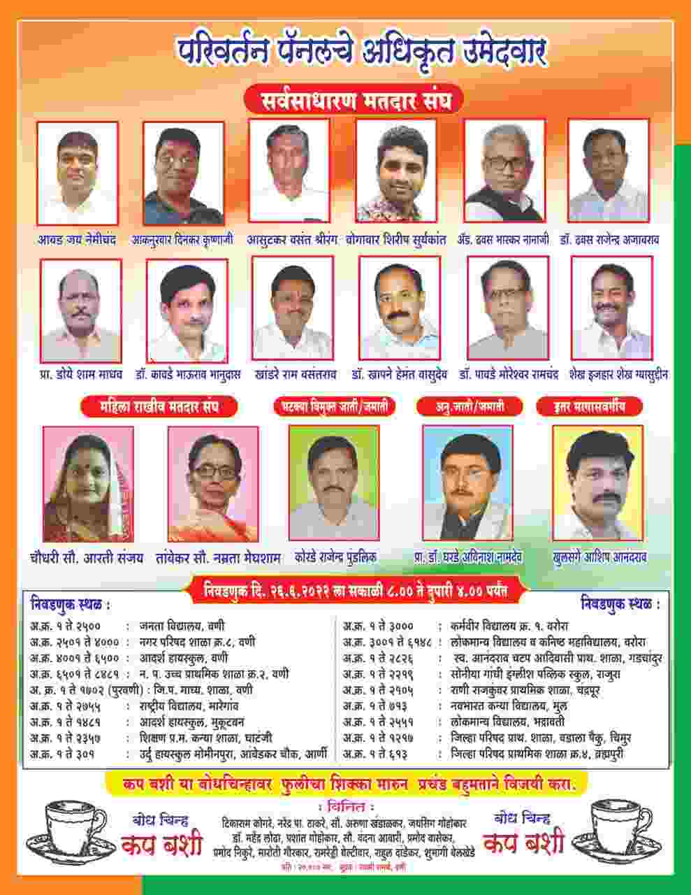 परिवर्तन पॅनलच्या उमेदवारांमध्ये 4 डॉक्टर आहेत. त्यात डॉ. मोरेश्वर पावडे, डॉ. भाऊराव कावडे, डॉ. राजेंद्र ढवस, डॉ. हेमंत खापने यांचा समावेश आहे. प्राध्यापक उमेदवार म्हणून प्रा. शाम डोये, प्रा. अविनाश घरडे तर वकील म्हणून ऍड. भास्कर ढवस उमेदवार आहे. याशिवाय तरुण व तडपदार राजकीय व सामाजिक व्यक्ती म्हणून ओळख असलेले माजी जि. प. सदस्य आशिष खुलसंगे तसेच इजहार शेख व जयकुमार आबड हे परिवर्तन पॅनलचे युवा चेहरे आहे. महिला नेतृत्व म्हणून सौ. आरती संजय चौधरी व पतसंस्थेचे मुख्य कार्यकारी अधिकारी यांची भार्या सौ. नम्रता मेघशाम तांबेकर निवडणूक रिंगणात आहे.