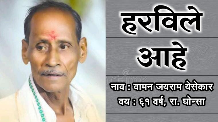 वणी बहुगुणी : तालुक्यातील घोन्सा येथील वामन जयराम येसेकार (61) हे दि. 18 जुलै रोजी सकाळी 9 वाजता कोणालाही न सांगता घरुन निघून गेले. कुटुंबीयांनी शोध घेतले असता ते मिळून आले नाही. याबाबत त्यांचे पुत्र धनविजय वामन येसेकार यांनी मंगळवारी मुकुटबन पोलीस स्टेशनमध्ये वडील बेपत्ता झाल्याची फिर्याद दाखल केली. वामन येसेकार यांच्या अंगावर काळ्या रंगाचा पॅन्ट व बारीक चेक्सचा शर्ट आहे. वरील वर्णानाचे व फोटोमधील इसम कोणाला दिसल्यास मुकुटबन पोलीस स्टेशन किंवा खालील नंबरवर संपर्क करण्याचे आवाहन कुटुंबीयांनी केले आहे.