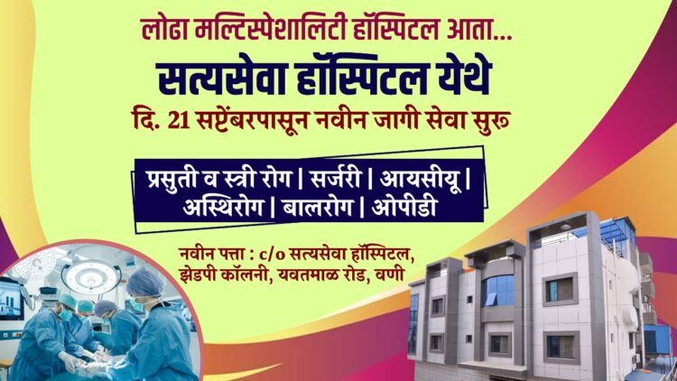 विवेक तोटेवार, वणी: वणीतील तेली फैल येथील लोढा मल्टिस्पेशालिटी हॉस्पिटल सोमवार दिनांक 21 सप्टेंबरपासून सत्यसेवा हॉस्पिटल झेड पी कॉलनी यवतमाळ रोड येथे स्थलांतर होत आहे. त्यामुळे रुग्णांनी आता नवीन ठिकाणी संपर्क साधावा असे आवाहन लोढा हॉस्पिटलतर्फे करण्यात आले आहे.