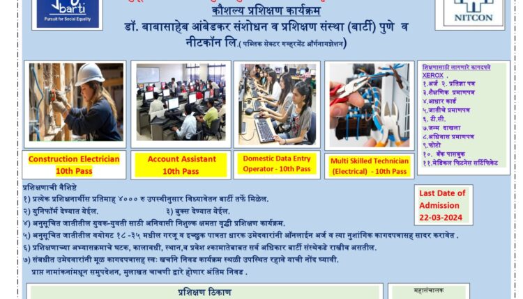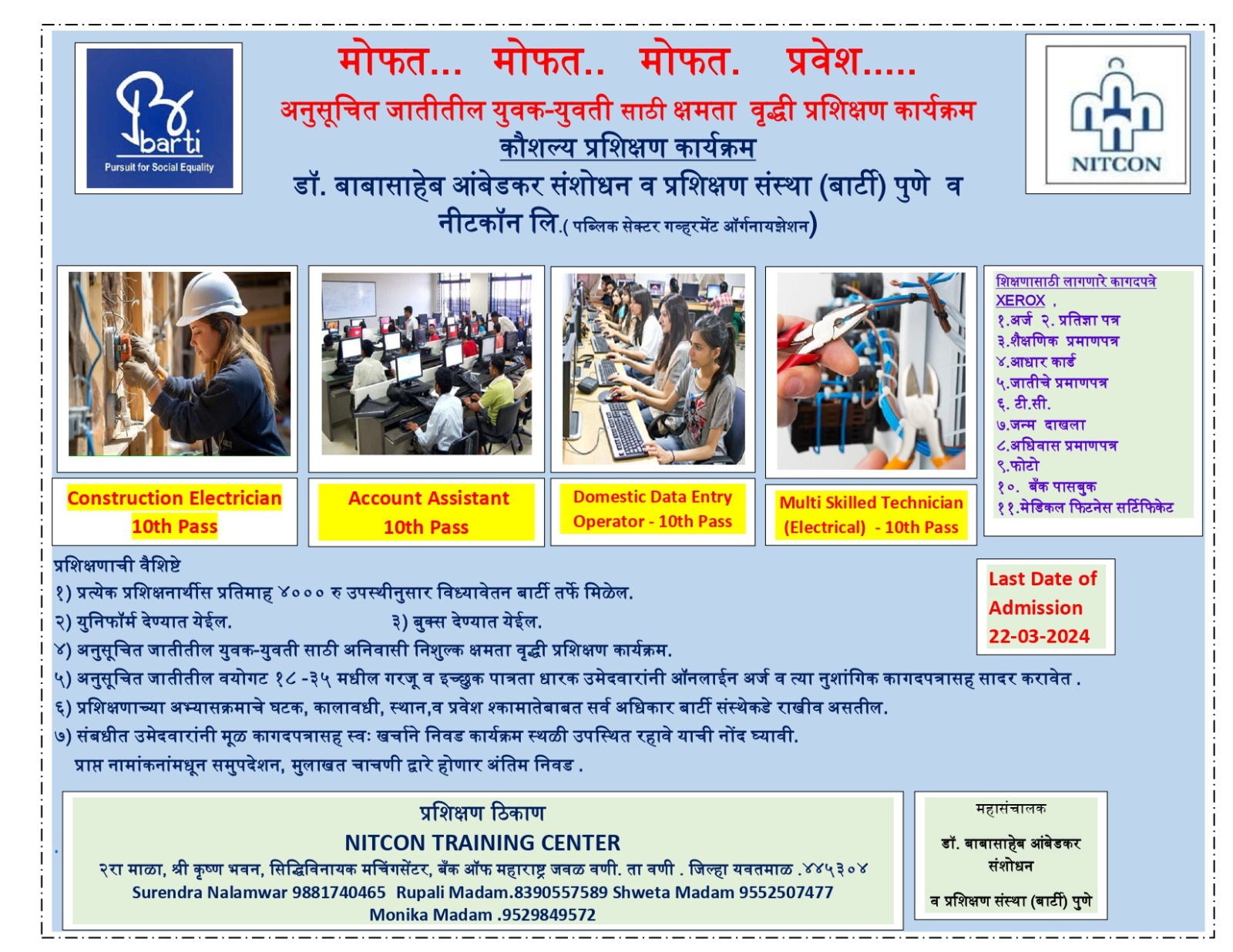 बहुगुणी डेस्क, वणी: डॉ. बाबासाहेब आंबेडकर संशोधन व प्रशिक्षण संस्था (बार्टी) द्वारा अनुसूचित जातीतील युवक युवतींसाठई मोफत कौशल्य प्रशिक्षण कार्यक्रमाचे आयोजन करण्यात आले आहे. यात कंस्ट्रक्शन इलेक्ट्रिशिअन, अकाउंट असिस्टंट, डोमेस्टिक डाटा एन्ट्री, मल्टी स्किल टेक्निशिअन (ईलेक्ट्रिक) कोर्स मोफत करता येणार आहे. या कोर्ससाठी 10 वी पास युवक युवतींना अप्लाय करता येईल. विशेष म्हणजे उपस्थितीनुसार विद्यार्थ्यांना प्रति माह विद्यावेतन देखील मिळेल. सदर कोर्स हे निटकॉन ट्रेनिंग सेंटर, महाराष्ट्र बँक जवळ वणी येथे होत असून प्रवेशासाठी 24 मार्च ही अंतिम तारीख आहे. अवघे दोनच दिवस प्रवेशासाठी शिल्लक आहेत. त्यामुळे त्वरित संपर्क साधावा असे आवाहन निटकॉन तर्फे करण्यात आले आहे. अधिक माहिती व प्रवेश निश्चित करण्यासाठी 9881740465, 8390557589, 9552507477 या क्रमांकावर संपर्क साधावा.