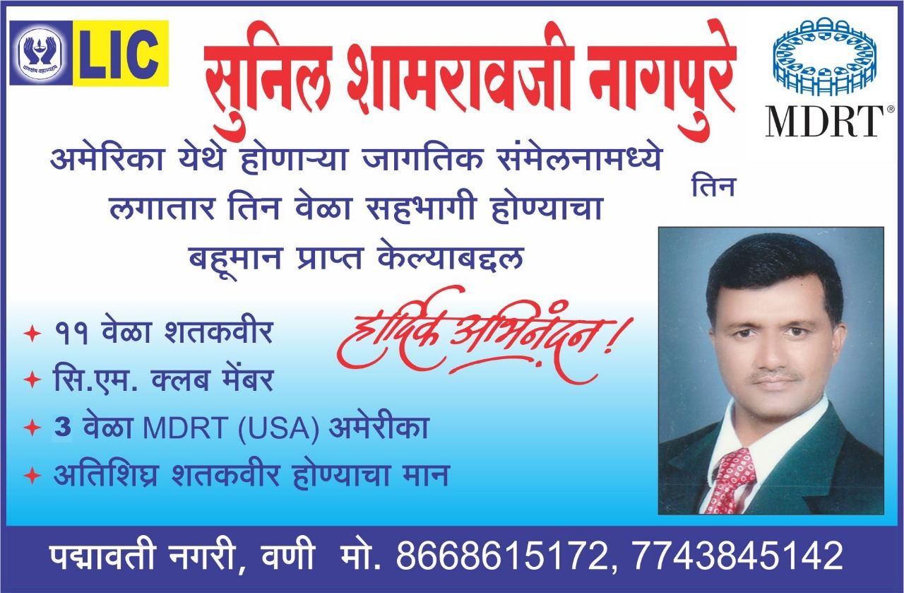 जितेंद्र कोठारी, वणी: भारतीय जीवन विमा निगम, वणी शाखेचे विमा अभिकर्ता सुनिल शामरावजी नागपुरे यांनी MDRT हा बहुमान प्राप्त झाला आहे. सलग तीनदा त्यांना हा बहुमान मिळाला आहे. त्यांच्या या यशामुळे त्यांना अमेरिका येथे होणा-या मिलियन डॉलर राउंड टेबल कॉन्फरन्ससाठी जाण्याची संधी मिळाली आहे.