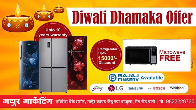 वस्तूंचा डेमो बघून ऑनलाईनपेक्षाही कमी दरात वस्तू करता येणार खरेदी.... मासिक किस्त खरेदीवर 1 EMI माफ व 25 हजारांपर्यंत कॅशबॅक.... फ्रिज वॉशिंग मशिनवर मायक्रोव्हेव ओव्हन गिफ्ट... भाग्यवान ग्राहकांना कार जिंकण्याची संधी ही उपलब्ध... अधिक माहितीसाठी संपर्क मयूर मार्केटिंग, मार्केट रोड वणी, MO - 9822228730 9511793963